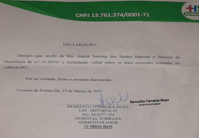 A nossa redação ainda, entrou em contato com o Sr. Benedito Ferreira Rosa, administrador do Hospital Sobrasa, que relatou ter tomado conhecimento da situação, e que já teria acionado o departamento jurídico da unidade de saúde, e dentro em breve será emitida uma nota pública pelo hospital.