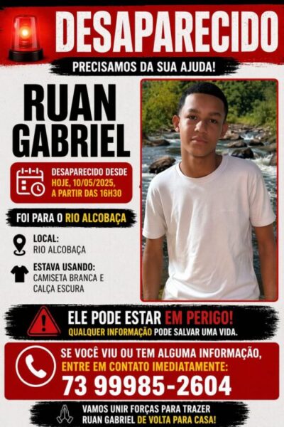 Um adolescente identificado como Ruan Gabriel está desaparecido desde a tarde deste sábado, 10 de maio de 2025, em Alcobaça, no extremo sul da Bahia. De acordo com informações divulgadas pela família, o jovem foi visto pela última vez por volta das 16h30, após sair em direção ao Rio Alcobaça.