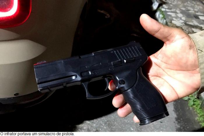 Um dos assaltantes, que é menor de 14 anos, foi detido por um grupo que estava no local. O infrator portava um simulacro de pistola e chegou a ser agredido. O seu comparsa conseguiu fugir e ainda não foi localizado.
