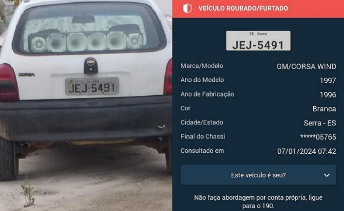 Ao chegar no local, os policiais constataram que o som do veículo já estava em um volume adequado, mas ao verificar a documentação do carro, encontraram uma ocorrência de furto no Banco Nacional de Dados (BND). O veículo é um GM Corsa Wind, ano 1997, cor branca, placa JEJ-5491, licenciado em Serra/ES.