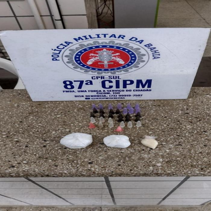 Os PMs fizeram buscas no local e encontraram uma sacola com três embalagens com cocaína e um pino com a mesma droga. Na sacola havia também 30 pinos vazios. A droga e o material foram apresentados na delegacia de Teixeira de Freitas.