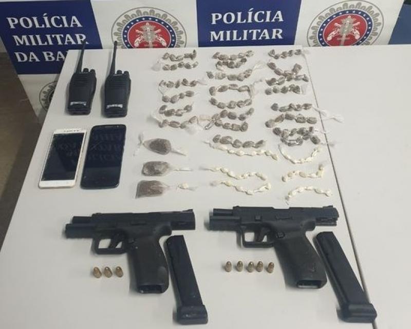 Na ação policial de hoje, foram apreendidas com os criminosos 2 pistolas TP9 CANIK, com numeração suprimida, 8 munições de calibre .9mm, 107 papelotes de maconha, 40 pedras de crack, 2 rádios transceptores e 2 dois aparelhos celulares.
