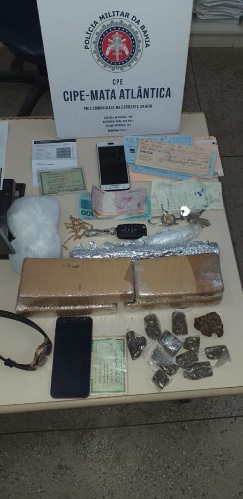 Na busca pessoal foi encontrada uma porção de maconha, em continuidade, foi localizado no quintal da residência uma mochila com mais entorpecentes.