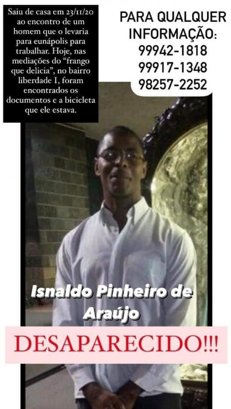 Dez dias se passaram desde que Isnaldo Pinheiro de Araújo, 44 anos, saiu de Teixeira de Freitas para confirmar um emprego e não retornou.