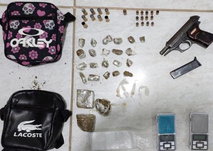 De acordo com a Polícia Militar, foram apreendidas uma pistola calibre 380, drogas, duas balanças de precisão e um celular.