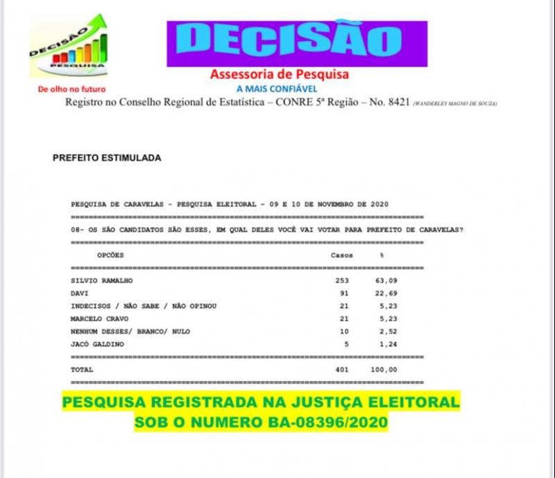 O prefeito de Caravelas e candidato a reeleição, Silvio Ramalho (PP), lidera com folga a corrida da sucessão municipal com 63% das intenções de voto contra seu principal opositor, Davi do Povão (Pros), que pontuou 22%, segundo pesquisa registrada na Tribunal Superior Eleitoral (TSE) sob numero BA 03896/2020, realizada entre os dias 8 e 9  de novembro.