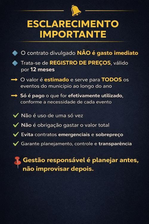 Segundo a administração municipal, o contrato não configura gasto excessivo, mas sim uma medida de planejamento, legalidade e gestão responsável dos recursos públicos, assegurando que os eventos do município sejam realizados com estrutura adequada, transparência e respeito ao dinheiro público.