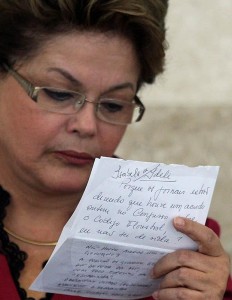 No início da noite desta quinta-feira (30), a assessoria de imprensa do Palácio do Planalto informou que a resposta que aparece no bilhete escrito pela presidente Dilma é da ministra do Meio Ambiente, Izabella Teixeira.