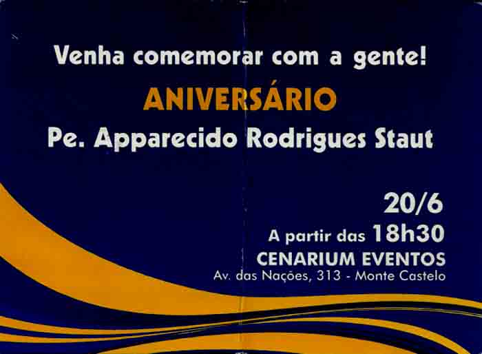 Como em outros anos o aniversário do padre Apparecido Staut foi comemorado com pouca pompa, as pessoas que receberam o convite estão estranhando. Algumas lembram um café da manhã, outras de um bolo na casa dele e até de um almoço ou de um jantar na casa de amigos, mas nunca de uma festividade com tantos convites sendo distribuídos e num local suntuoso como agora.