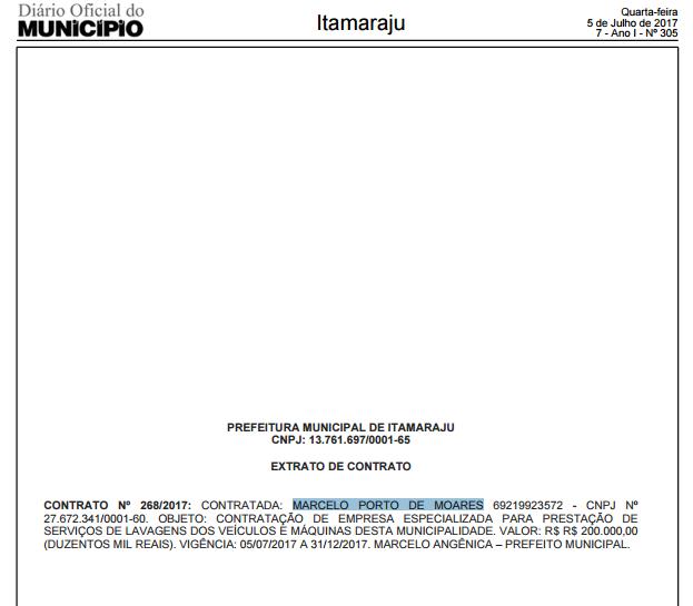 Foi publicado no Diário Oficial do município de Itamaraju no último dia 02 de julho, o Pregão Presencial número 059/2017, para contratação de empresa especializada para prestação de serviço de lavagens dos veículos e máquinas do município, sendo vencedora a empresa MARCELO PORTO DE MORAES, CNPJ: 27.672.341/0001-60, com endereço a Avenida Rio Amazonas, 01, bairro Várzea Alegre em Itamaraju, no valor de R$ 200.000,00 (duzentos mil reais).