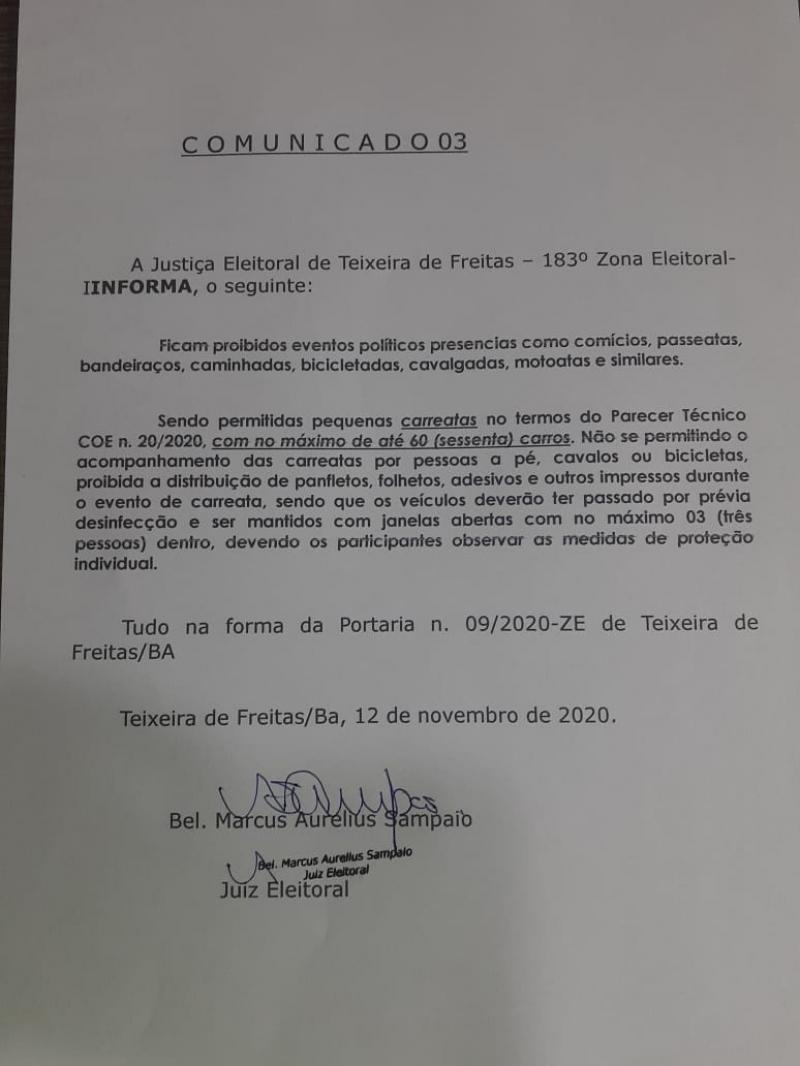 Um comunicado da Justiça Eleitoral de Teixeira de Freitas, publicado na quinta-feira, 12 de novembro, libera a realização de carreatas com até 60 carros e 3 ocupantes por veículos, no entanto, antes da carreata todos os veículos precisam passar por um processo de desinfecção e higienização e todos os ocupantes deve adotar as medidas sanitárias de prevenção ao coronavírus.