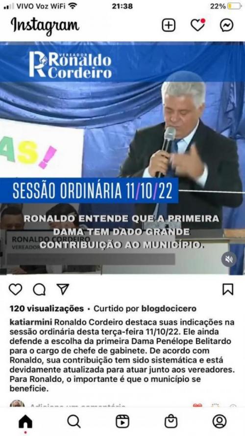 Uma prova evidente que quem gere a prefeitura é Penélope Belitardo, está na declaração do vereador Ronaldo Cordeiro na sessão da câmara municipal de terça-feira, 11 de outubro, como você pode conferir na imagem abaixo.