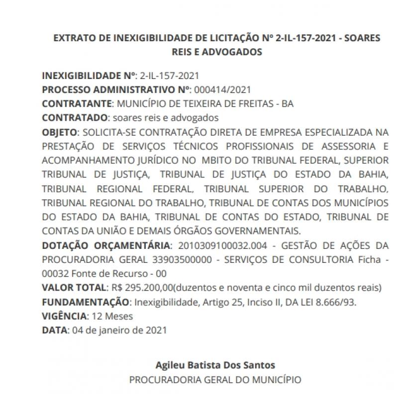O prefeito de Teixeira de Freitas, Marcelo Belitardo (DEM) contratou no último dia 12 de fevereiro, através do Extrato de Inexigibilidade de Licitação nº 2-IL 157 – 2021, a empresa Soares Reis e Advogados, CNPJ. 03.288.100/0001-53, com endereço comercial à Avenida Tancredo Neves, nº 2539, Condomínio CEO Salvador, Shopping Edifício Torre Nova Iorque, salas 2308, 2309, 2310, 2311 E 2312, para CONTRATAÇÃO DIRETA DE EMPRESA ESPECIALIZADA NA PRESTAÇÃO DE SERVIÇOS TÉCNICOS PROFISSIONAIS DE ASSESSORIA E ACOMPANHAMENTO JURÍDICO NO ÂMBITO DO TRIBUNAL FEDERAL, SUPERIOR TRIBUNAL DE JUSTIÇA, TRIBUNAL DE JUSTIÇA DO ESTADO DA BAHIA, TRIBUNAL REGIONAL FEDERAL, TRIBUNAL SUPERIOR DO TRABALHO, TRIBUNAL REGIONAL DO TRABALHO, TRIBUNAL DE CONTAS DOS MUNICÍPIOS DO ESTADO DA BAHIA, TRIBUNAL DE CONTAS DO ESTADO, TRIBUNAL DE CONTAS DA UNIÃO E DEMAIS ÓRGÃOS GOVERNAMENTAIS.