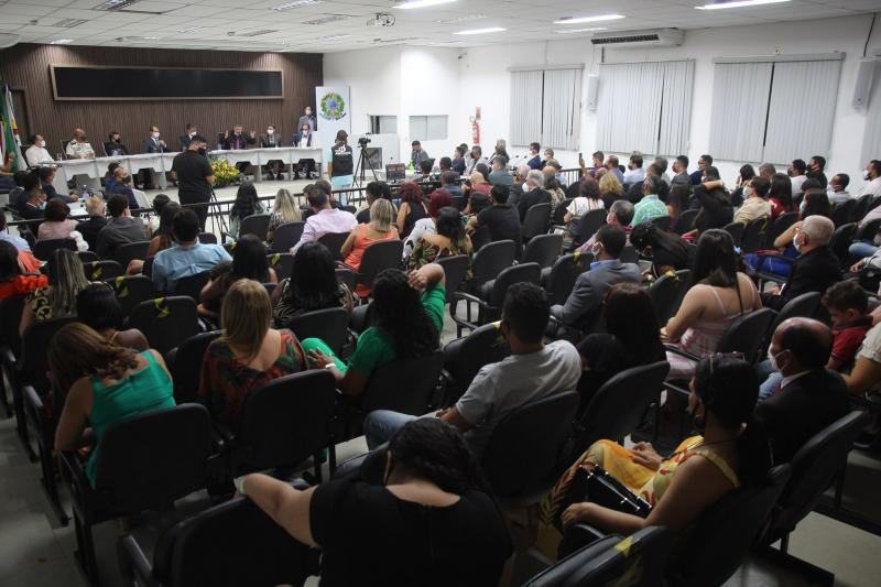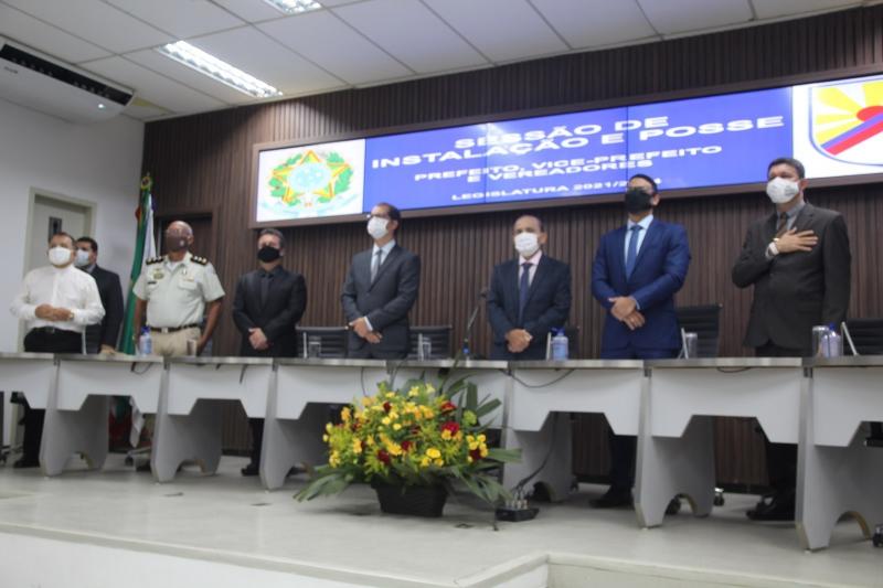 A Sessão de Instalação e Posse aconteceu no plenário da Câmara Municipal e reuniu autoridades locais e simpatizantes dos eleitos, observando o uso de máscara, álcool em gel e limitação de público.