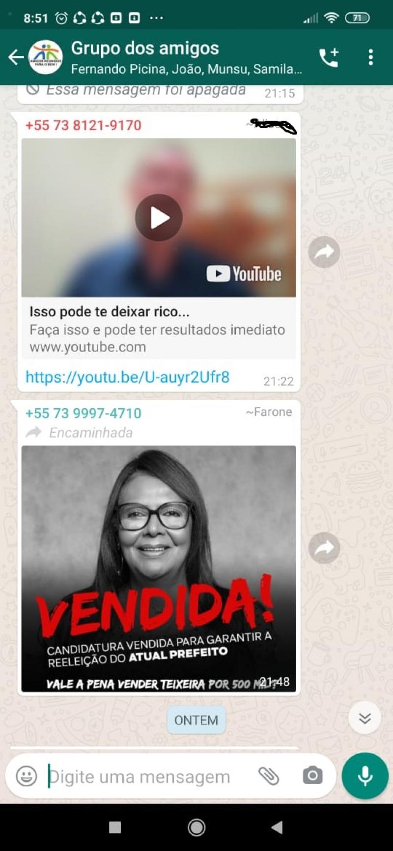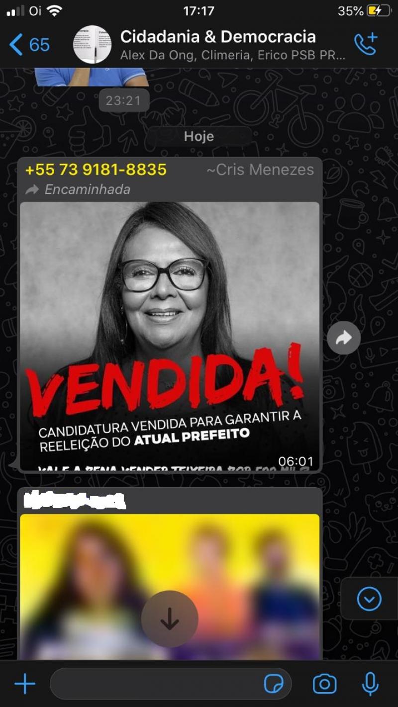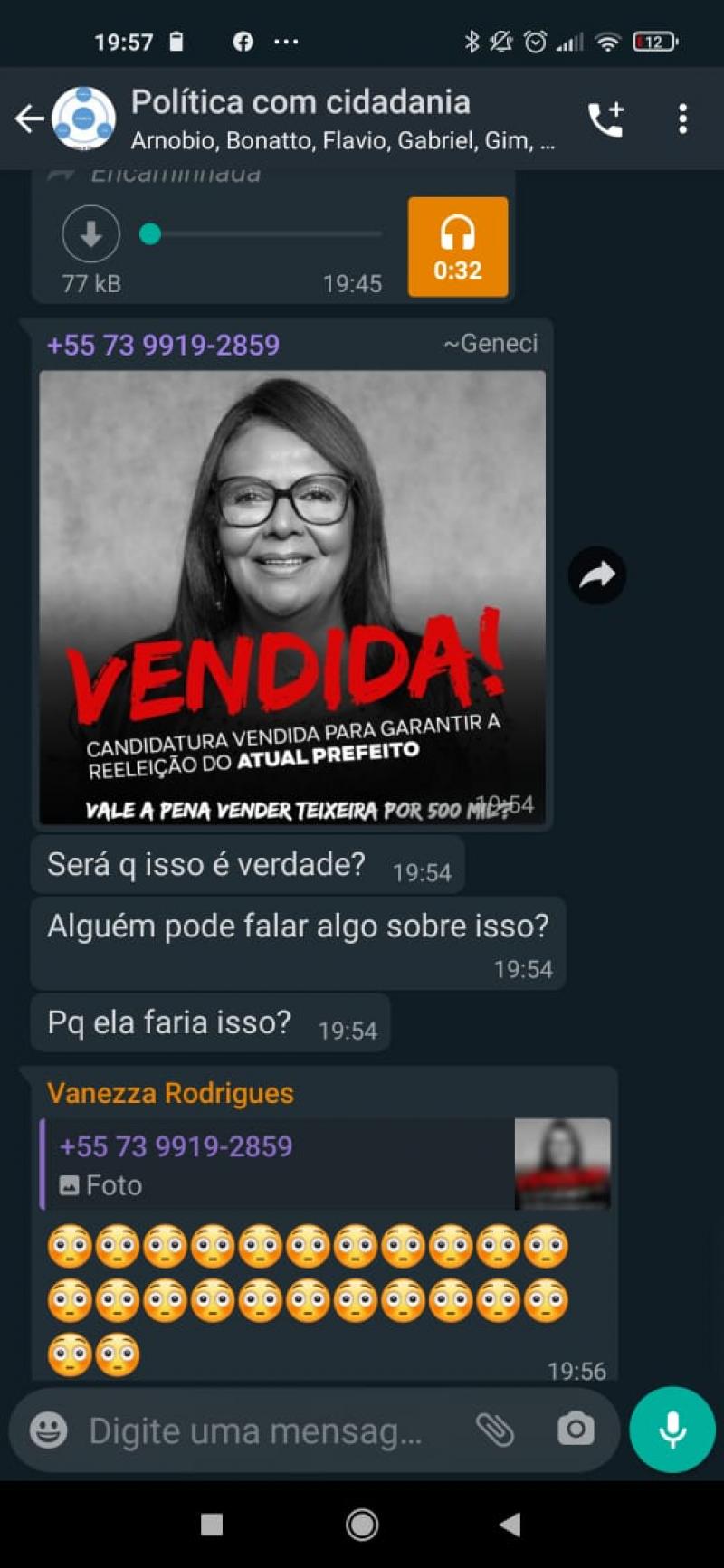 Confira o relato feito pela candidata Marta Helena na delegacia de polícia “ INFORMA A COMUNICANTE MARTA HELENA LEAL, ACOMPANHADA DO SEU ADVOGADO FELIPE SANTOS BRITO OAB xxxxx, QUE VEM SENDO INJURIADA ATRAVÉS DE UM GRUPO DE WHATSAPP COM O No 73-99919-2859 GENECI NO GRUPO POLITICA COM CIDADANIA, E OUTRO No 73-99181-8835 CRIS MENEZES NO GRUPO CIDADANIA E DEMOCRACIA, E OUTRA COM O No 73-99997-4710 FARONE, NO GRUPO DOS AMIGOS. QUE A COMUNICANTE É CANDIDATA A PREFEITA DESTA CIDADE E TEVE CONHECIMENTO DAS SEGUINTES POSTAGENS: ”VENDIDA, CANDIDATA VENDIDA PARA GARANTIR A REELEIÇÃO DO ATUAL PREFEITO, VALE A PENA VENDER TEIXEIRA POR R$ 500 MIL?”. QUE OS REFERIDOS GRUPOS SÃO DE OPOSIÇÃO A COMUNICANTE. É O REGISTRO. ”.