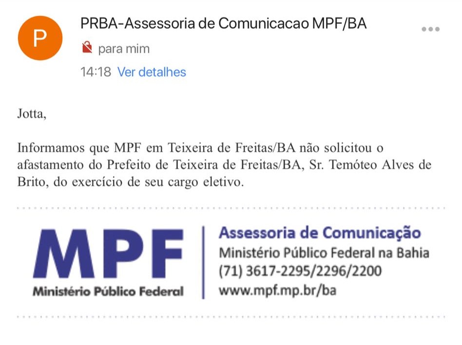 Informamos que MPF em Teixeira de Freitas/BA não solicitou o afastamento do Prefeito de Teixeira de Freitas/BA, Sr. Temóteo Alves de Brito, do exercício de seu cargo eletivo.