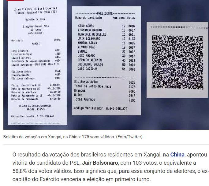Na manhã deste domingo, 7 de outubro, começaram a surgir várias imagens de boletins de urna com os números de votos para presidente em países da Oceania e da Ásia, onde a votação já está encerrada devido à diferença de fuso horário. As imagens trazem as supostas votações de cidades como Sidney e Melbourne, na Austrália; Auckland, Nova Zelândia e Pequim, na China.