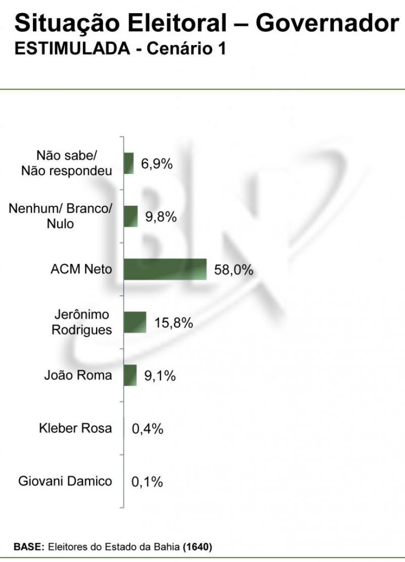 Quando não são apresentados os candidatos, o ex-prefeito de Salvador também aparece à frente na corrida, com 23,7%, enquanto Jerônimo tem 7% e Roma fica com 4,5%. Rosa foi citado por 0,2% dos entrevistados e até mesmo o governador Rui Costa, que não pode tentar uma nova reeleição, apareceu, com 1,3%.