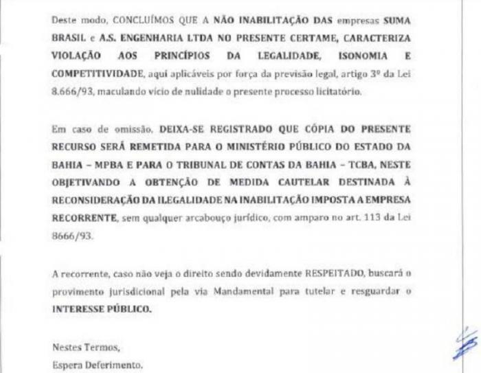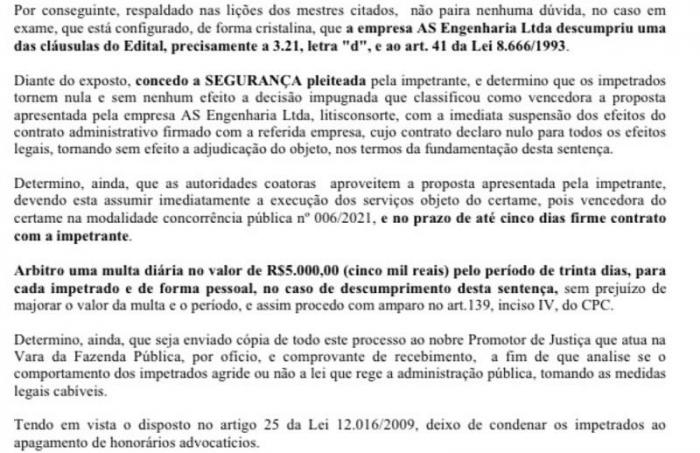 Ocorre que o caso foi parar na Justiça, e mesmo após o Ministério Público ter dado parecer favorável à empresa AS Engenharia, nesta última terça-feira (03), o Juiz da Vara da Fazenda Pública da Comarca de Teixeira de Freitas, decidiu favorável à empresa Fortaleza, concedendo a SEGURANÇA pleiteada pela impetrante, e determinando “que os impetrados tornem nula e sem nenhum efeito a decisão impugnada que classificou como vencedora a proposta apresentada pela empresa AS Engenharia Ltda”. Na decisão, o juiz arguiu que determinou a notificação das autoridades apontadas como coatoras, os quais resistiram quanto a pretensão deduzida na exordial, argumentando a inépcia da inicial e no mérito sustentam o acerto da proposta vencedora no cálculo do BDI”.