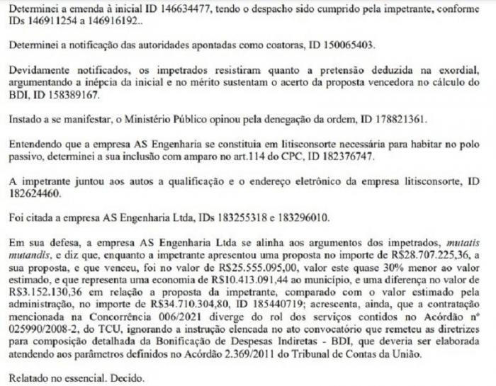 “Instado a se manifestar, o Ministério Público opinou pela denegação da ordem. […] Foi citada a empresa AS Engenharia Ltda, e em sua defesa, a empresa AS Engenharia Ltda se alinha aos argumentos dos impetrados, mutatis mutandis, e diz que, enquanto a impetrante apresentou uma proposta no importe de R$28.707.225,36, a sua proposta, e que venceu, foi no valor de R$25.555.095,00, valor este quase 30% menor ao valor estimado, e que representa uma economia de R$ 10.413.091,44 ao município, e uma diferença no valor de R$ 3.152.130,36 em relação a proposta da impetrante, comparado com o valor estimado pela administração, no importe de R$ 34.710.304,80”.