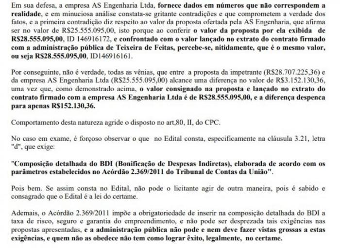 “Em sua defesa, a empresa AS Engenharia Ltda, fornece dados em números que não correspondem a realidade, e em minuciosa análise constata-se gritante contradições e que comprometem a verdade dos fatos, e a primeira contradição diz respeito ao valor da proposta ofertada pela AS Engenharia, que afirma ser no valor de R$ 25.555.095,00, isto porque ao conferir o valor da proposta por ela exibida de R$ 28.555.095,00, e confrontado com o valor lançado no extrato do contrato firmado com a administração pública de Teixeira de Feitas, percebe-se, nitidamente, que é o mesmo valor, ou seja R$ 28.555.095,00”.