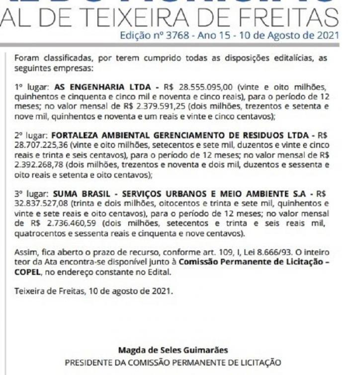 Teixeira de Freitas: Nossa equipe de reportagem recebeu informações sobre a decisão da Justiça relacionado a um mandado de segurança, perpetrado pela empresa Fortaleza Ambiental de Resíduos Ltda, com sede em Vitória/ES, contra a empresa AS Engenharia Ltda, com sede em Salvador/BA, tendo como coautor, o prefeito municipal de Teixeira de Freitas, Dr. Marcelo Belitardo. A empresa AS Engenharia venceu a Licitação Concorrência Pública n° 006/2021 e desde então é responsável pelos Serviços de Limpeza Urbana no Município de Teixeira de Freitas. A empresa Fortaleza Ambiental, desde o início do certame, encontrou erros na proposta da concorrente e protocolou diversos recursos administrativos.