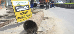 A rede de tubulação de canos em plástico PVC está sendo substituída por manilhas de 100 cm, ao longo de todo o trecho do canal de drenagem.