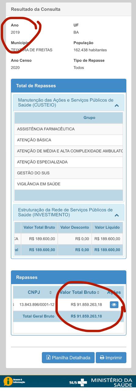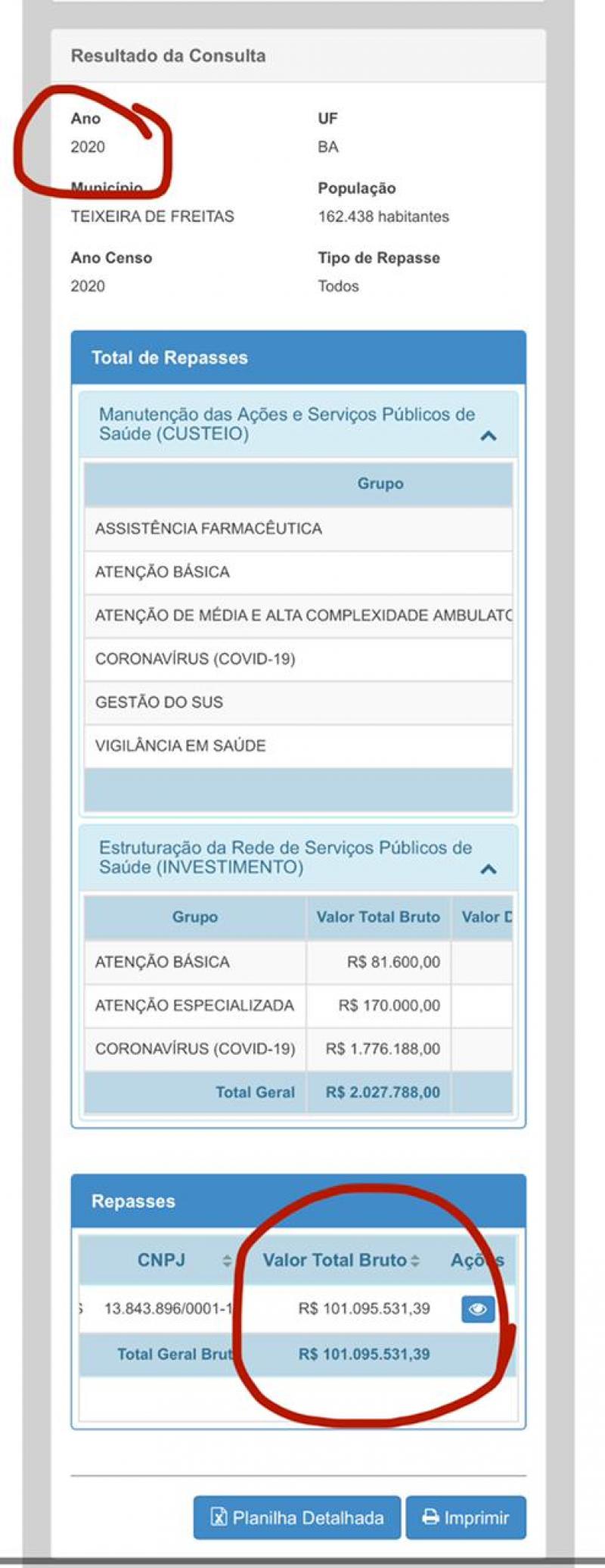Em Teixeira de Freitas no ano de 2019 quando ainda não existia a Pandemia do Coronavírus, o Município recebeu R$ 91.859.263,18 – para custear a saúde pública, já em 2020, ano da Pandemia em que os preços dos medicamentos, insumos e alta demanda da procura da população para tratamento da COVID-19 cresceram, o Governo Federal enviou ao município de Teixeira de Freitas o valor total de R$ 101.095.531,39 – ou seja, durante todo o ano de 2020 em plena pandemia comparado ao ano de 2019, Teixeira de Freitas recebeu o valor de R$ 9.236.268,21 a mais.