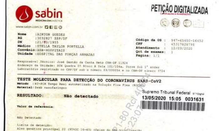 O resultado dos 3 exames feitos pelo presidente, Jair Bolsonaro, para covid-19 foram divulgados nesta quarta-feira, 13 de maio, pelo Supremo Tribunal Federal (STF) por ordem do ministro Ricardo Lewandowski. Segundo os documentos, Bolsonaro usou o codinome de “Airton Guedes” e “Rafael Augusto Alves da Costa Ferraz”. Nos 3 exames divulgados, o resultado foi negativo para a presença do novo coronavírus.