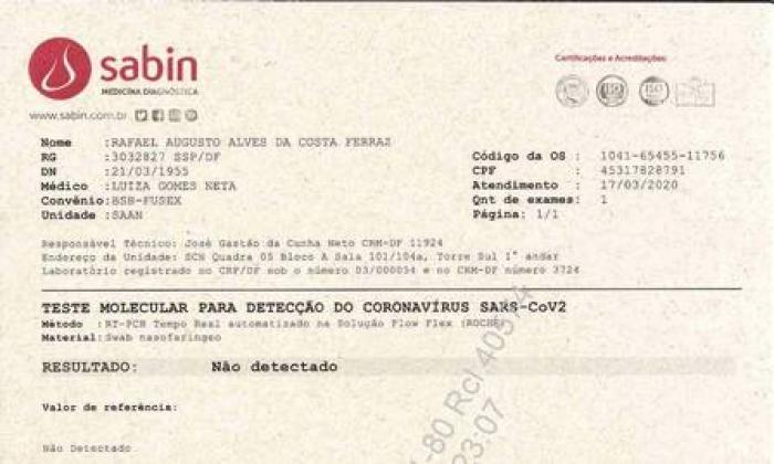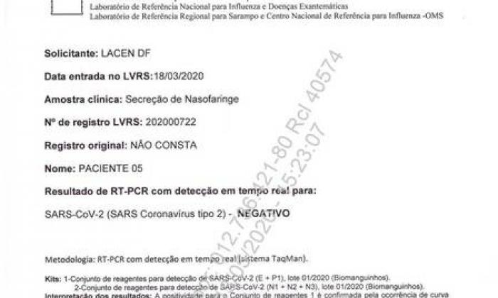 O terceiro exame foi feito em 18 de março pela Fundação Oswaldo Cruz (Fiocruz), ligada ao Ministério da Saúde e localizada no Rio de Janeiro, a pedido do Laboratório Central (Lacen) do Distrito Federal. No documento, aparece apenas a informação “Paciente 5” no campo em que é informado o nome da pessoa. Segundo a AGU, trata-se de Bolsonaro.