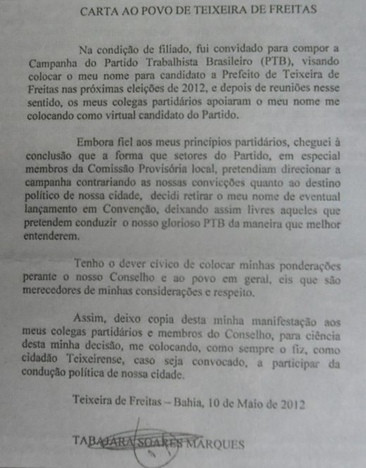 Tabajara não quis comentar os reais motivos da desistência, e superficialmente falou sobre um desentendimento com a comissão provisória do partido em Teixeira de Freitas, veja abaixo, entrevista e a carta aberta elaborada pelo ex-candidato.