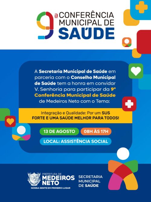 Com o tema “Integração e Qualidade: Por um SUS forte e uma saúde melhor para todos” e orientada pelo eixo “Planejando e fortalecendo o SUS em Medeiros Neto”, a conferência se apresenta como um espaço democrático de debate e construção coletiva. O objetivo é ouvir as demandas da população e propor soluções para aprimorar o atendimento e consolidar políticas públicas de saúde mais eficientes e inclusivas.