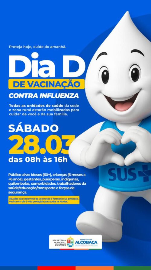 A Secretaria Municipal de Saúde de Alcobaça promove, neste sábado (28), o Dia D de vacinação contra a influenza, com atendimento das 8h às 16h em todas as unidades de saúde da sede e da zona rural. A ação tem como objetivo ampliar a cobertura vacinal e proteger a população contra complicações causadas pelo vírus da gripe.