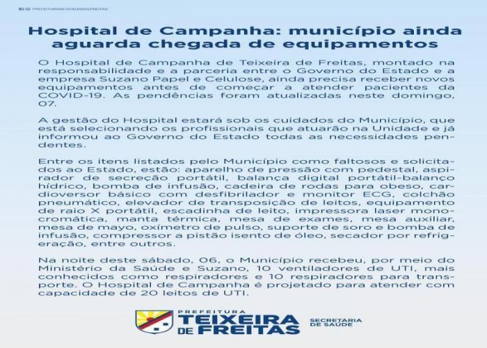 O Hospital de Campanha de Teixeira de Freitas, montado na responsabilidade e a parceria entre o Governo do Estado e a empresa Suzano Papel e Celulose, ainda precisa receber novos equipamentos antes de começar a atender pacientes da COVID-19. As pendências foram atualizadas neste domingo, 07.