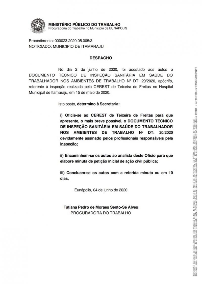 Uma vistoria determinada pela procuradora do Ministério Público do Trabalho, Tatiane Moraes, encontrou diversas irregularidades no Hospital Municipal de Itamaraju.