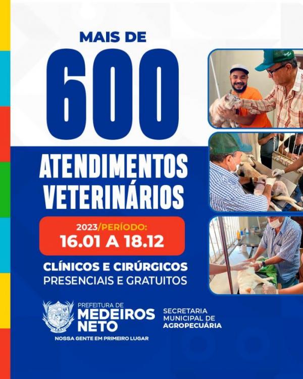 A Prefeitura de Medeiros Neto, por meio de Secretaria Municipal de Agropecuária, alcançou em 2023 a marca de 639 atendimentos veterinários realizados presencial e gratuitamente.