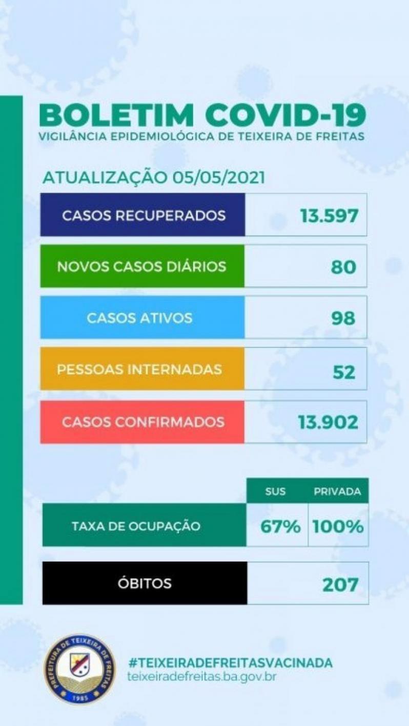 Nesta quarta-feira 05 de maio, a Secretaria de Saúde de Teixeira de Freitas informou que houve registro de 80 novos casos positivados. Até o momento são 13.902 casos confirmados. Destes, 98 são considerados ativos. Até o momento são 207 mortes. A taxa de letalidade em Teixeira de Freitas é de 1,48%, em relação aos casos confirmados. Nossa taxa de recuperação é de 97,80%, são 13.597 recuperados.
