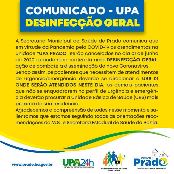 O processo de desinfecção foi marcado para esta segunda-feira, 1º de junho. Em razão disso, A Secretaria Municipal de Saúde comunica que os atendimentos de urgência e emergência, excepcionalmente, nesse dia, serão prestados na UBS 01, localizada no Centro da cidade.